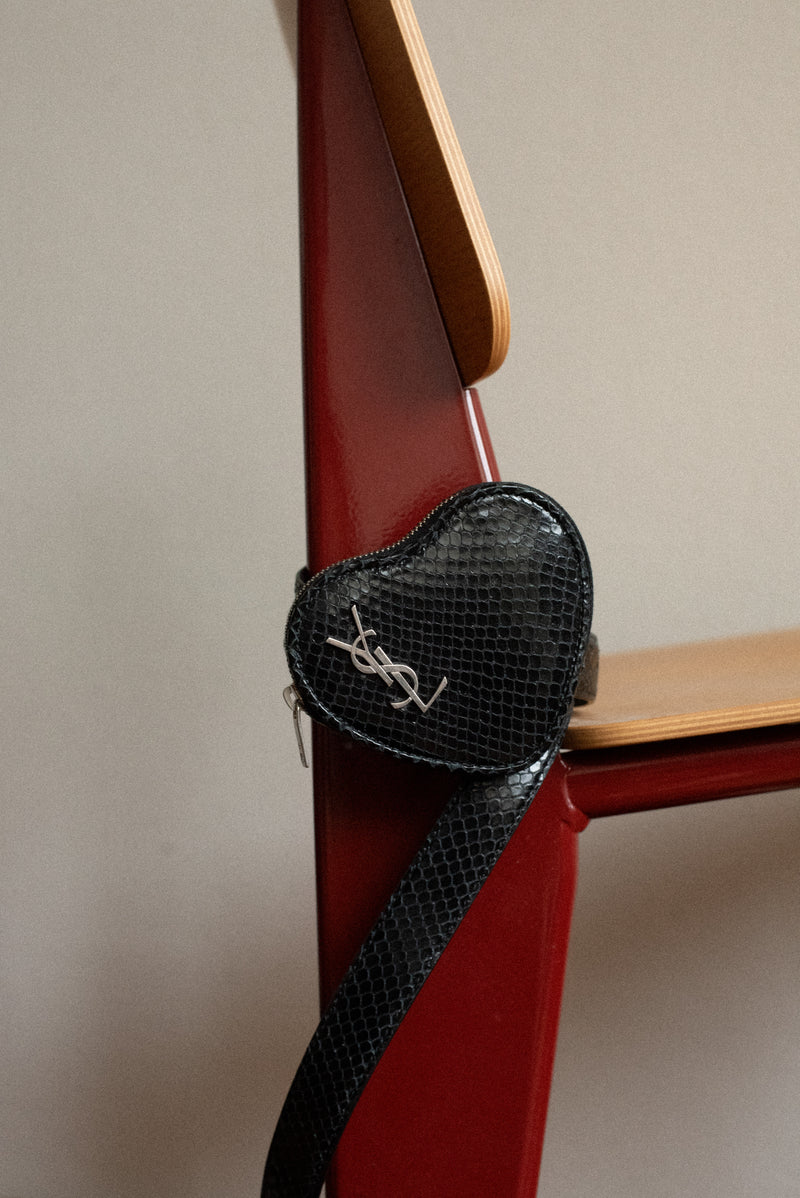White tank top, Saint Laurent. Black pants, Saint Laurent. Python skirt, Dolce & Gabbana. Belt bag, Saint Laurent. Shoes, Prada. All sourced by Archive Store.